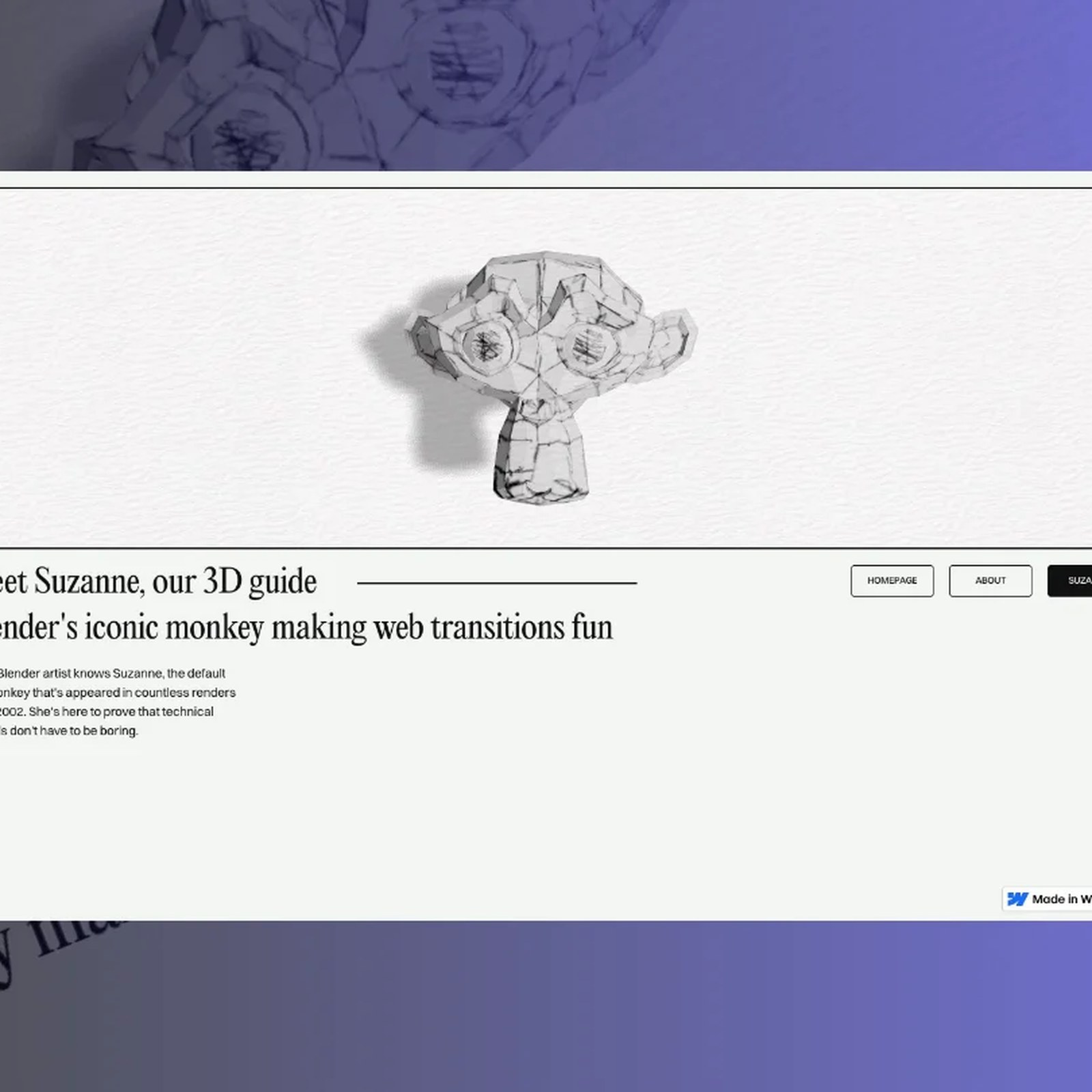 The objects in the scene carry their own visual weight. A pen, a ceramic cup, and a Suzanne head all appear in the Blender-modeled scene. Each object wears UV maps drawn entirely by hand in Photoshop, giving the surfaces a loose, sketch-like quality. A paper texture applied in multiply mode settles over the whole composition, softening the renders into something that feels hand-made rather than digital. The stack includes Vite for the build system, SplitText from GSAP for animated typography, and custom shaders to handle the organic material look.