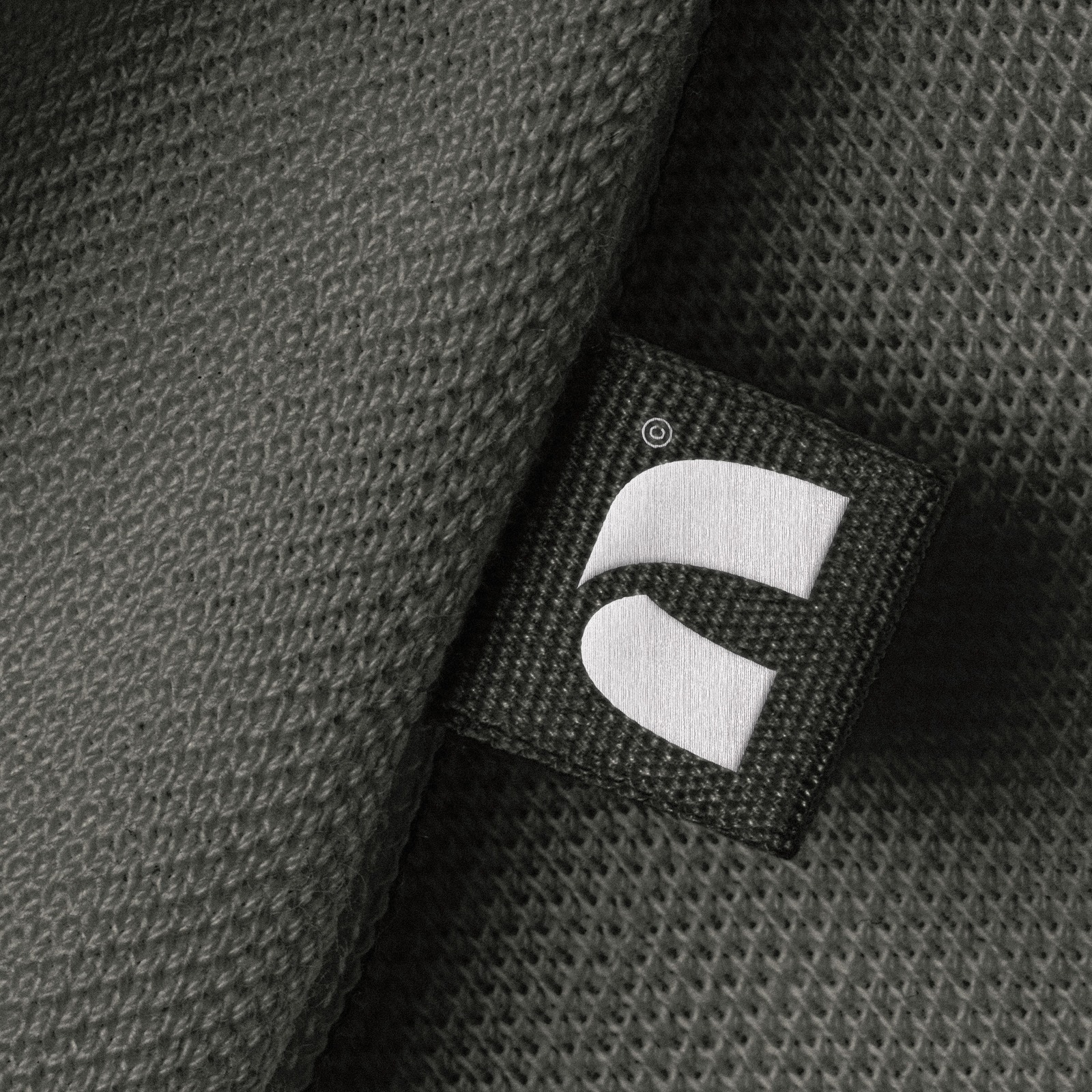 The brand identity appears on a woven clothing label stitched onto an olive-toned knit fabric — not a business card, not a letterhead. That choice signals something about the studio's creative appetite. Shot in close-up macro with soft directional light, the woven tag reads as a fashion or interiors brand, not a traditional agency.
