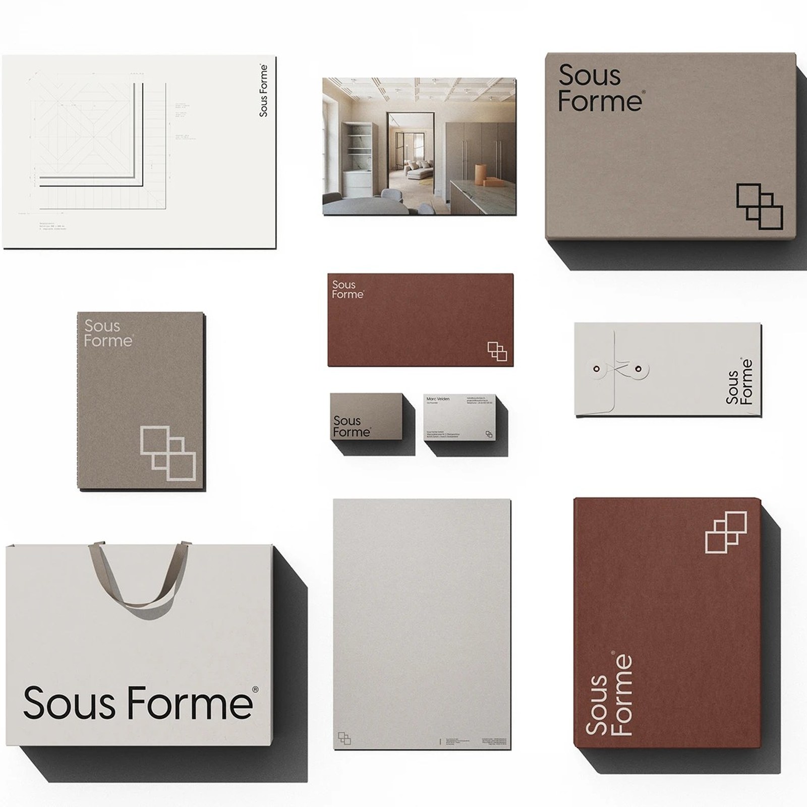 Brand designer Gideon Phillip developed the Sous Forme brand identity to mirror that architectural conviction. The result is a system of restrained precision. Every element earns its place on the page. Nothing performs. Everything means.